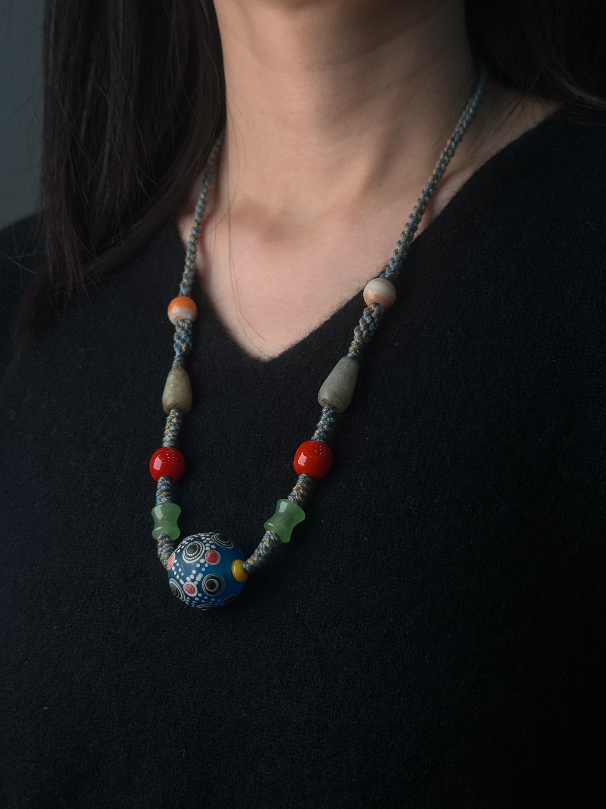 Blue Pattern Glass Bead Necklace