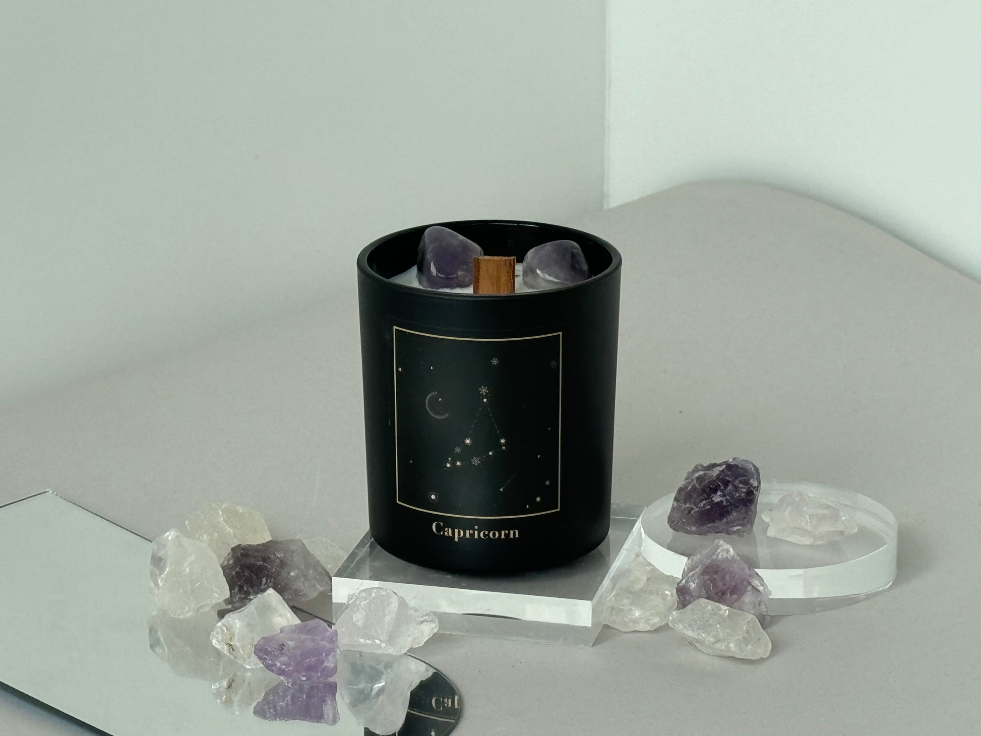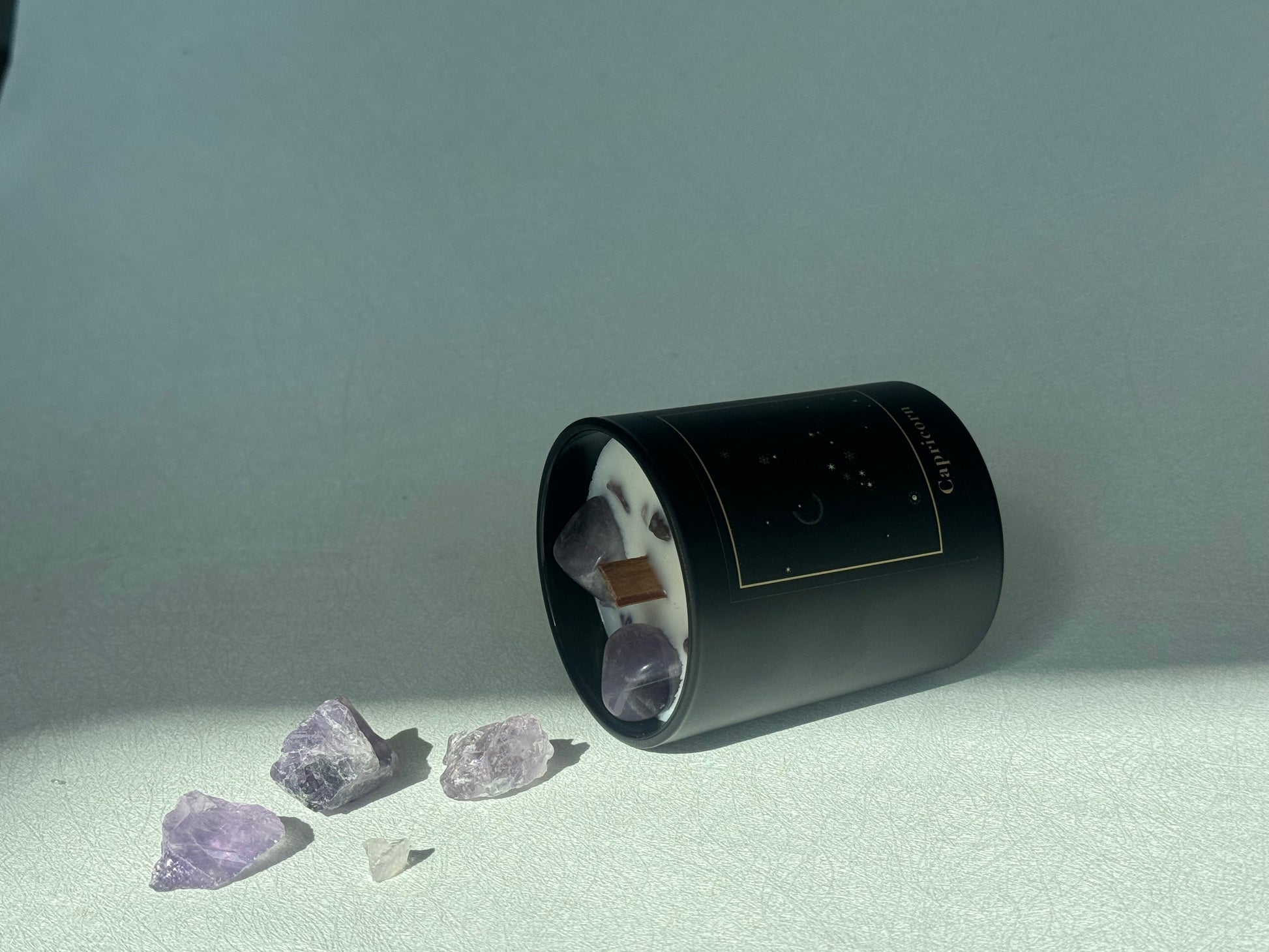 This scented candle exudes strength and focus with its refined, minimalist design. Infused with amethyst, a stone known for its ability to balance emotions and enhance career success, this candle helps you stay grounded while pursuing your goals. Hand-poured with eco-friendly soy and beeswax, it offers a clean burn that radiates a soft, calming light. Encased in a sleek black frosted glass jar, this candle serves as both a powerful energy tool and a stylish decor piece, bringing tranquility and inspiration to any space. Perfect for those seeking to elevate their professional and personal journeys.